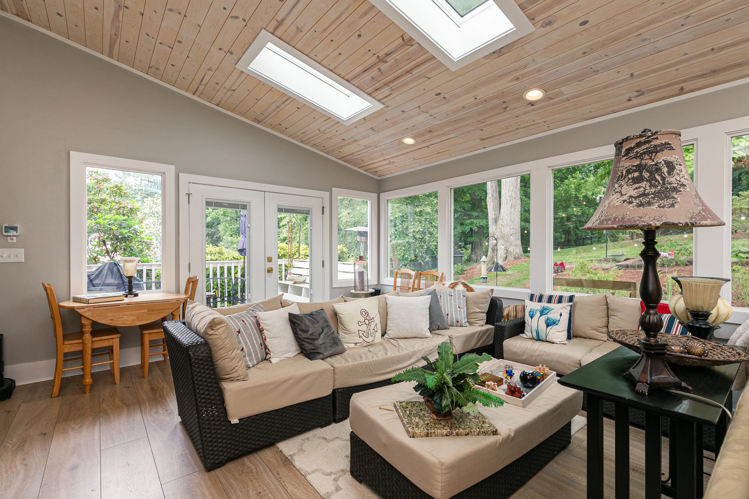 Beyond the kitchen, the renovation opens into a bright and inviting sunroom. Large open-panel windows flood the space with natural light, creating a perfect setting for both relaxation and gathering. At one end, a contemporary fireplace provides a striking focal point, while a custom wet bar and coffee station at the other end ensure both comfort and convenience. Together, these spaces form a cohesive and impressive transformation that blends style, warmth, and functionality.